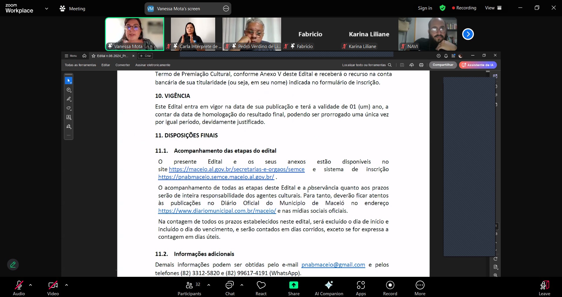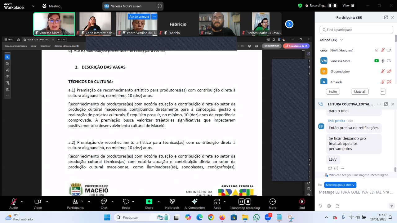 Em uma iniciativa para facilitar o acesso aos recursos da Política Nacional Aldir Blanc, o Comitê de Cultura de Alagoas, em parceria com o Ministério da Cultura, realizou uma leitura coletiva de edital em Maceió. O evento online atraiu um público de 66 pessoas, que puderam esclarecer dúvidas e sugerir mudanças para o Edital nº 8/2024 da Secretaria Municipal de Cultura.
