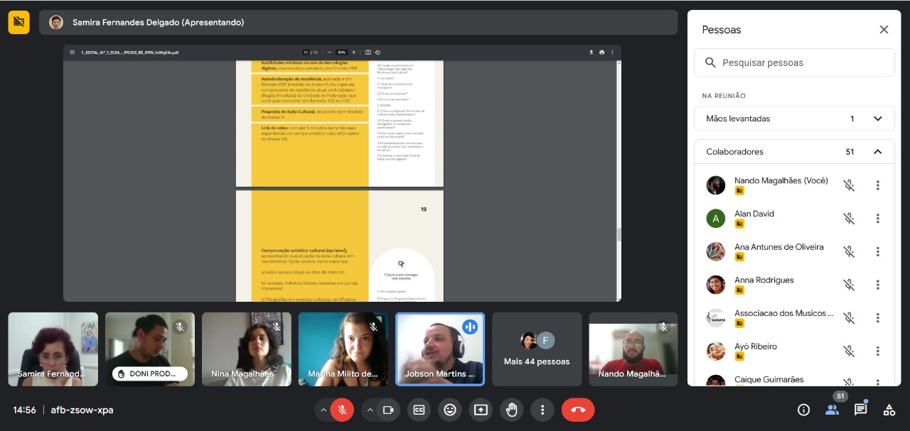 A transmissão contou com a presença de representantes do Comitê de Cultura de Alagoas, do Escritório Estadual do MinC em Alagoas e dos Institutos Federais do Rio Grande do Norte e de Alagoas. Durante o evento, os participantes puderam conhecer melhor os detalhes do edital e esclarecer suas principais dúvidas sobre o processo de inscrição.